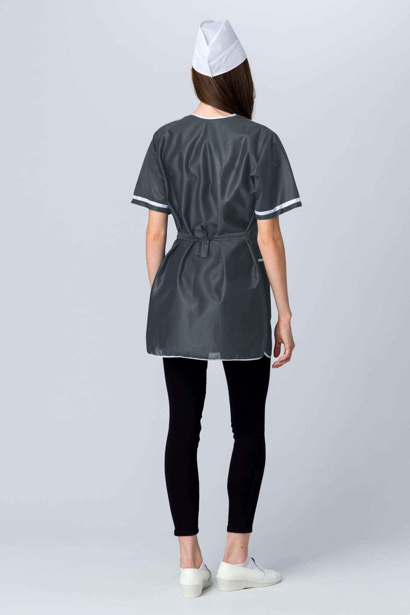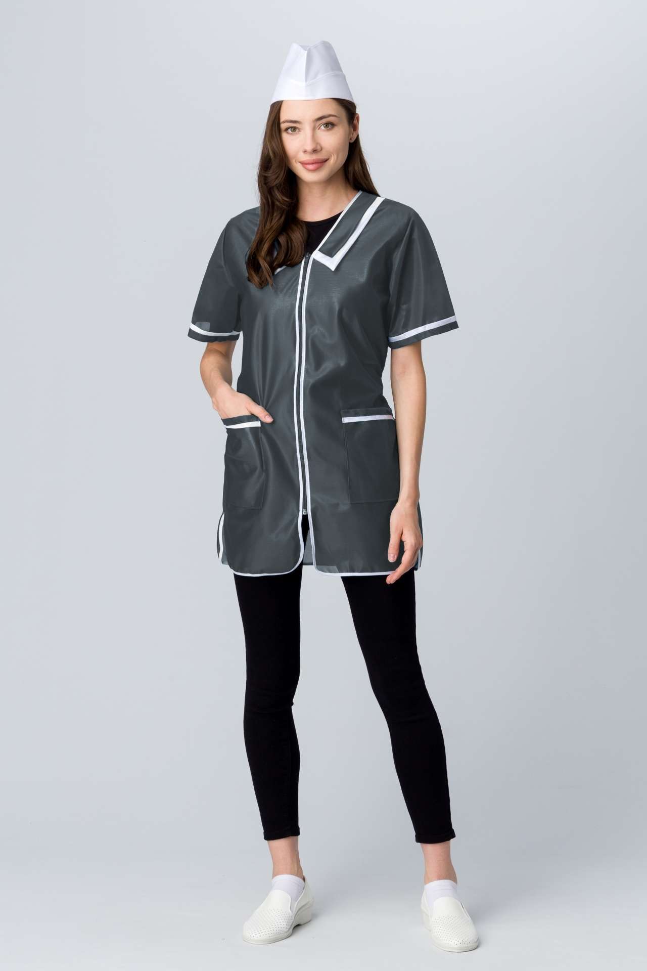 Представляем вашему вниманию женский халат на молнии с коротким рукавом, выполненный из высококачественного нейлона. Этот халат идеально сочетает в себе стиль и функциональность, что делает его незаменимым в различных сферах деятельности. Благодаря прямому силуэту и длине до колена, он обеспечивает комфорт и свободу движений, а также подходит для использования в условиях, требующих соблюдения санитарных норм.