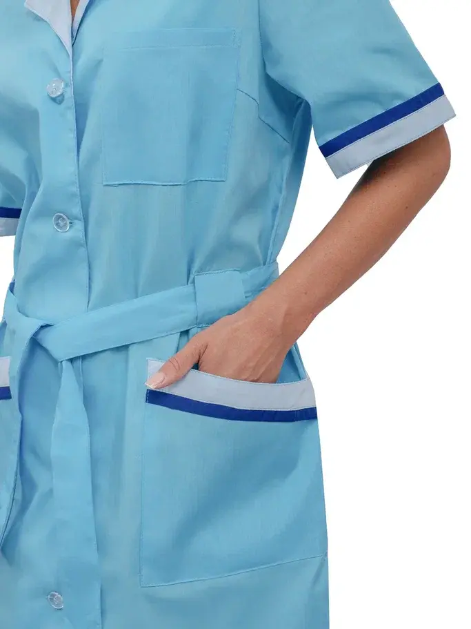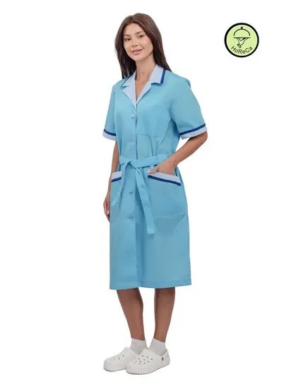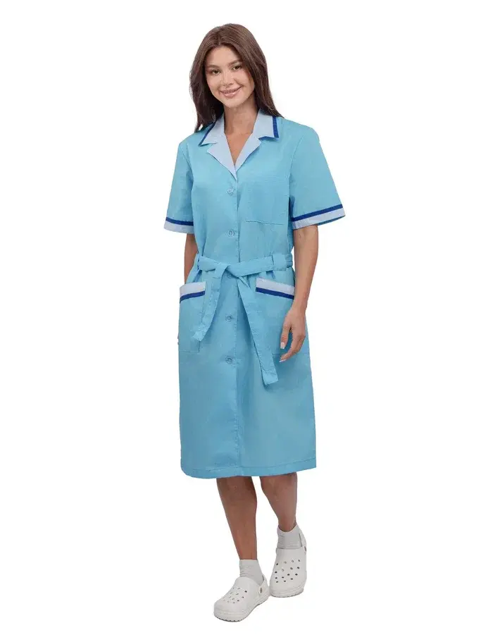 Представляем вам женский халат 'Прибой' в цветах голубой, светло-голубой и василек. Этот современный и удобный халат с свободной посадкой создан специально для работников сферы обслуживания, клининга и гостиничного бизнеса (HORECA). Изготовленный из высококачественной смесовой ткани, он обеспечивает защиту от загрязнений и гарантирует долговечность, сохраняя яркость цвета даже после многократных стирок.
