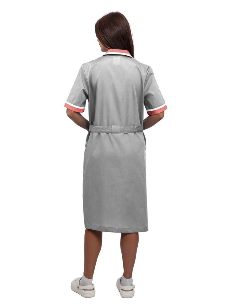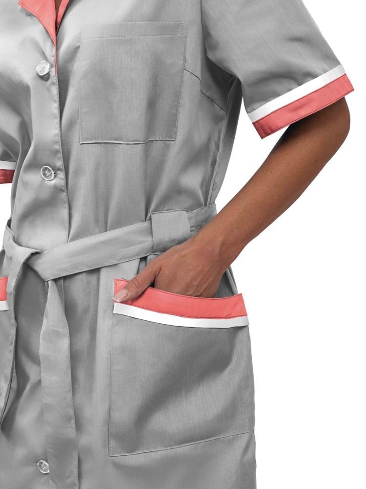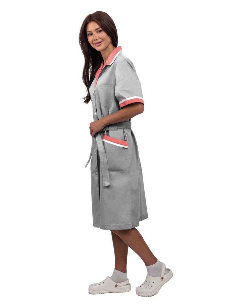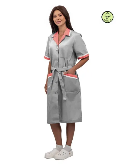 Представляем вашему вниманию женский халат "Прибой" в цветах светло-серый, коралловый и белый. Этот современный и удобный халат обеспечивает свободную посадку и выполнен из высококачественной смесовой ткани, что делает его идеальным решением для работников клининга, гостиничного бизнеса и других сфер обслуживания. Халат не только защищает от загрязнений, но и помогает поддерживать безупречный внешний вид сотрудников.