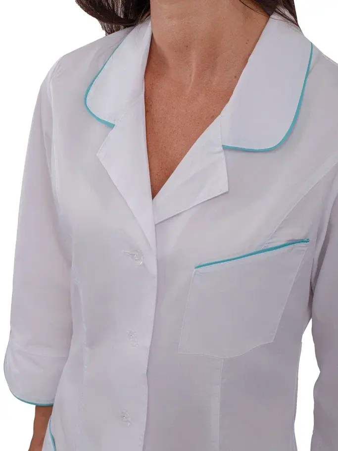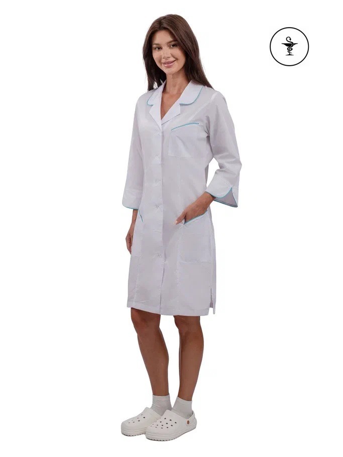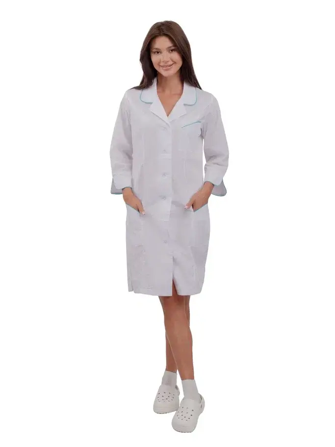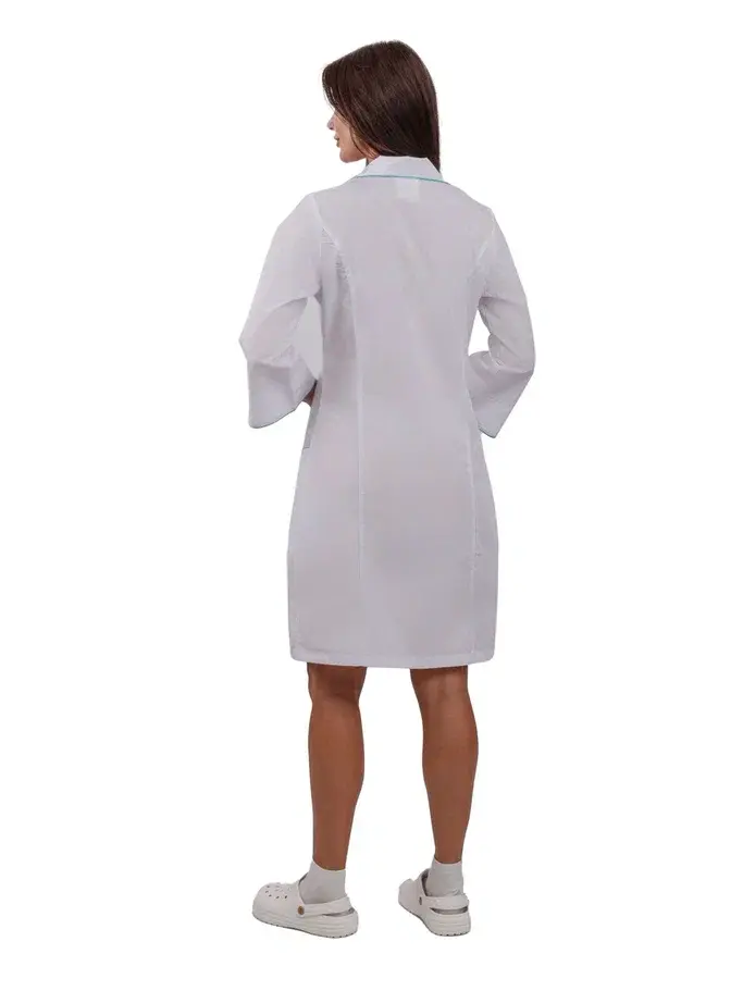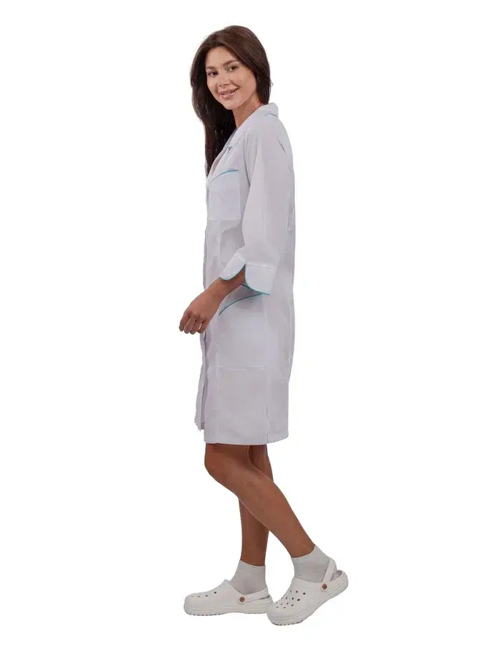 Представляем вашему вниманию женский халат "Вита" белого цвета с бирюзовой отделкой — идеальное решение для сотрудников косметологических и медицинских учреждений. Этот современный халат полуприлегающего силуэта сочетает в себе стиль, комфорт и высокое качество, что делает его незаменимым элементом рабочего гардероба.