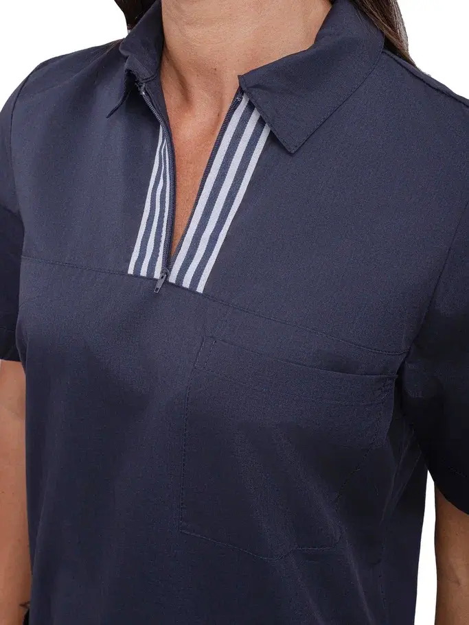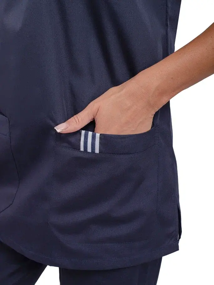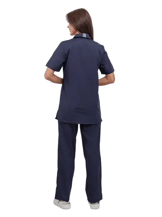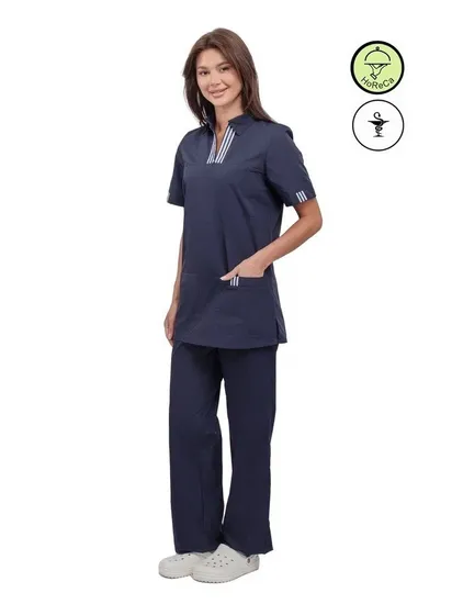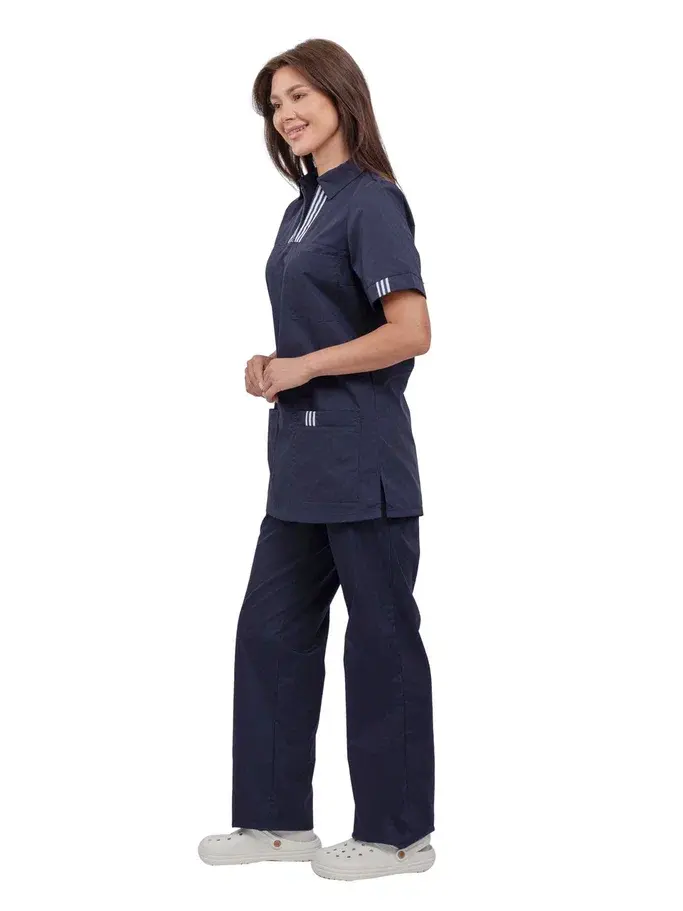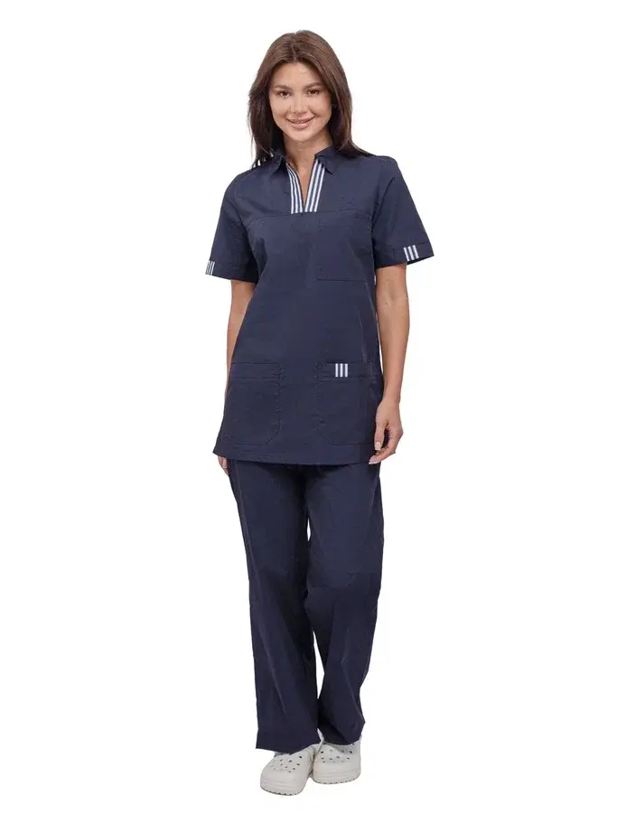 Костюм женский "Эра" в темно-синем цвете — это современное решение для работников сферы косметологии и медицинских учреждений. Изготовленный из высококачественной смесовой ткани, этот костюм обеспечивает не только стильный внешний вид, но и комфорт в работе. Он легко переносит многократные стирки и сохраняет презентабельный вид даже при длительном использовании.
