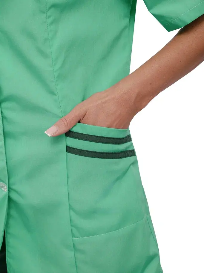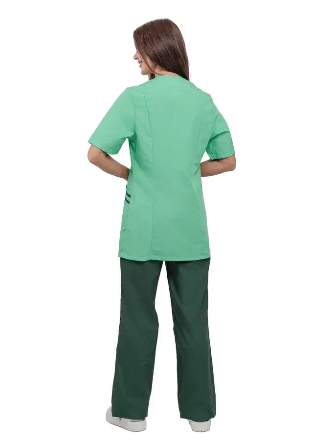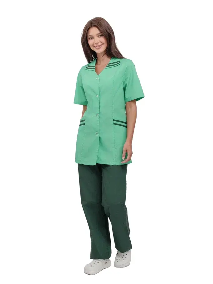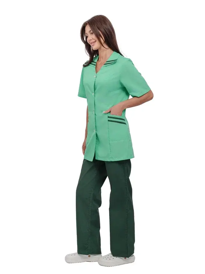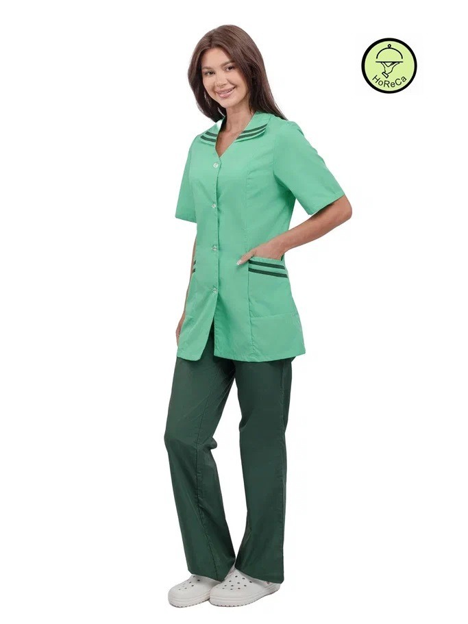 Костюм женский "Сфера" в мятном цвете с темно-зелеными брюками — это идеальное решение для предприятий, работающих в сфере обслуживания, клининга и гостиничного бизнеса (HORECA). Изготовленный из высококачественной смесовой ткани, этот костюм обеспечивает комфорт и стиль, позволяя сотрудникам выглядеть безупречно на протяжении всего рабочего дня.