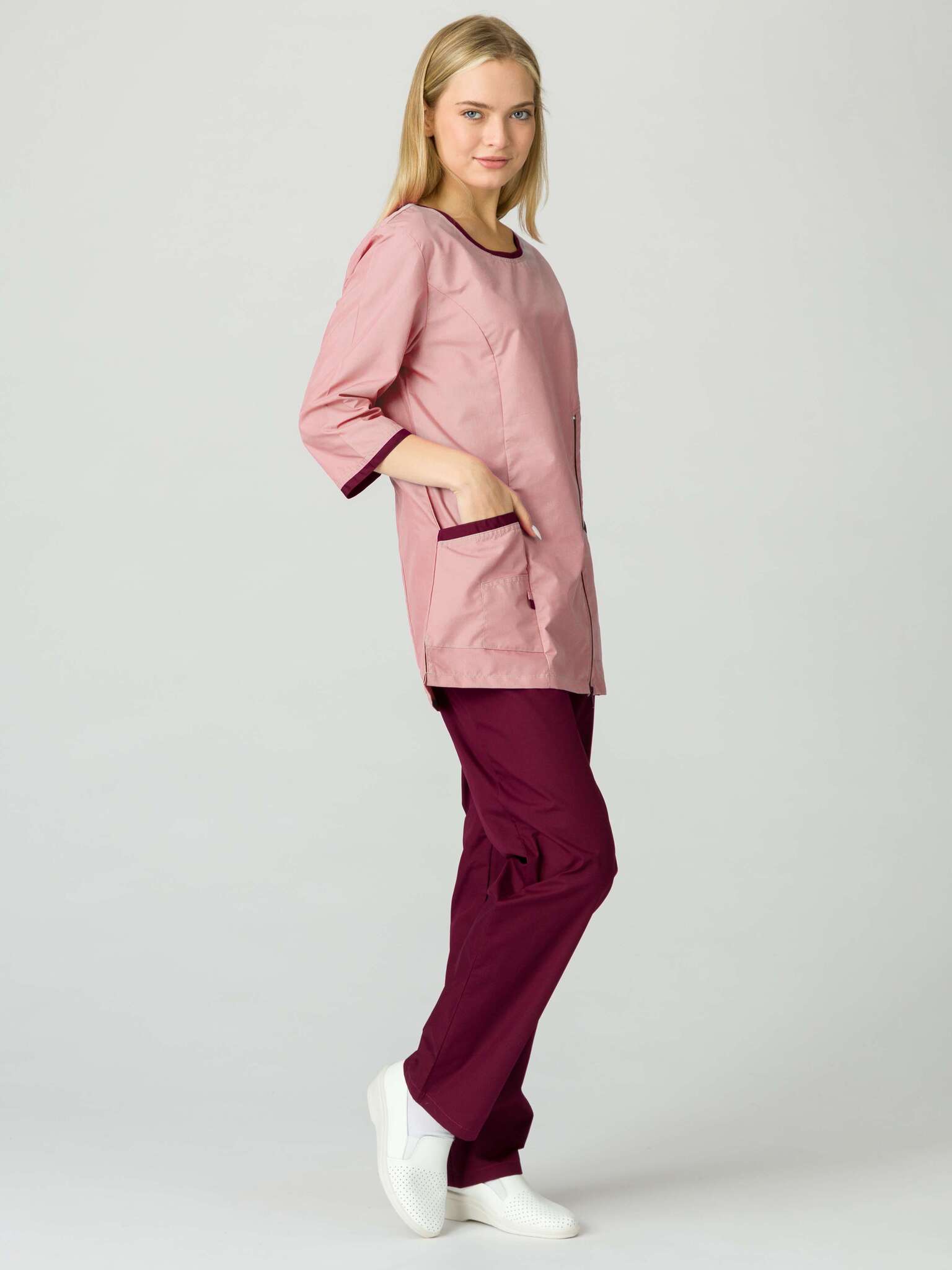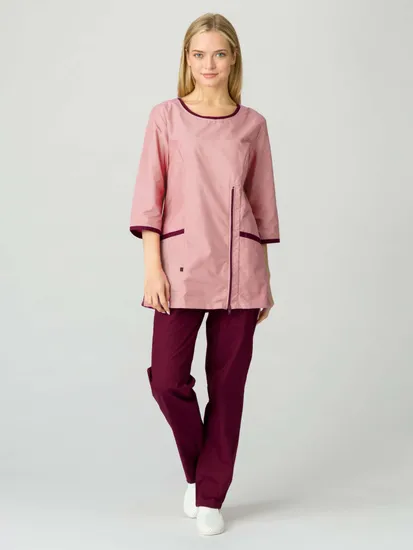 - Блуза: полуприталенный силуэт без центральной застежки, круглый вырез горловины, рукав 3/4, боковые карманы с контрастной окантовкой и нагрудный уменьшенный карман. Боковая молния до линии груди обеспечивает удобство при надевании.