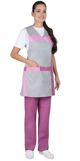 - Комбинированный дизайн: комплект состоит из фартука-сарафана и брюк, что обеспечивает удобство и свободу движений.