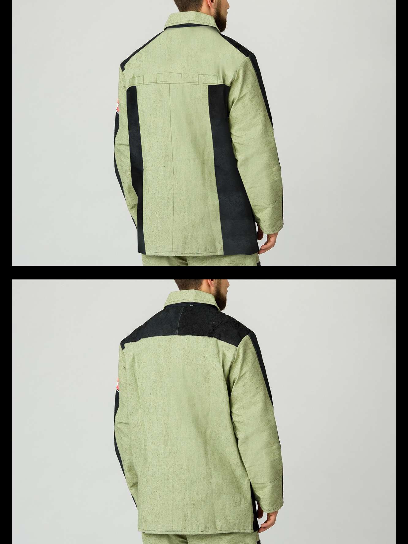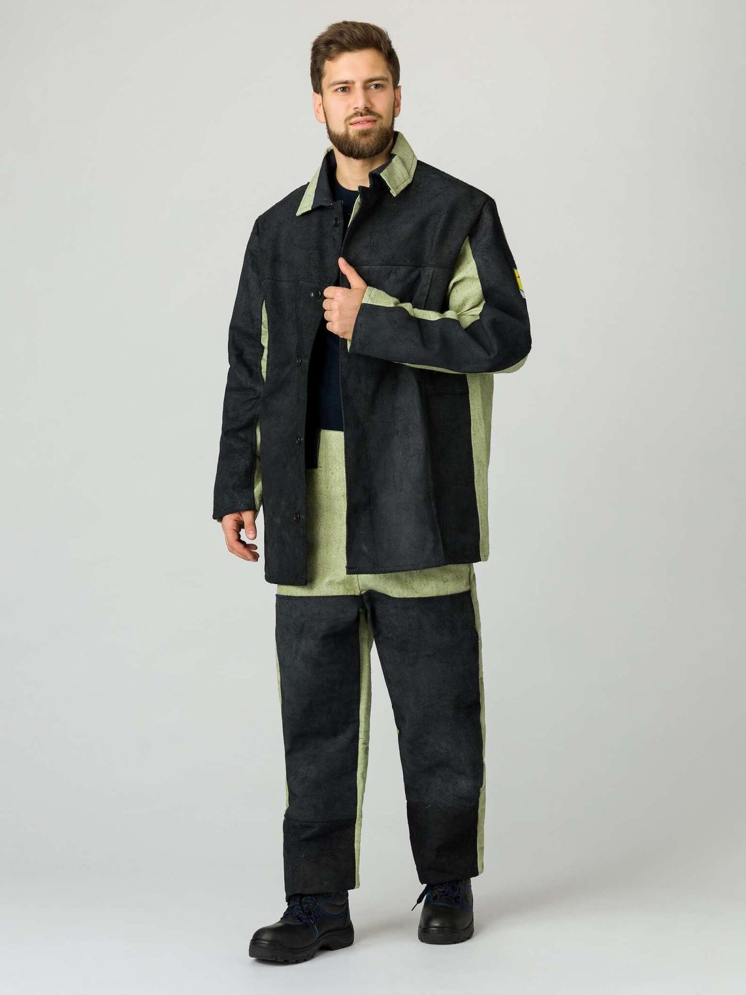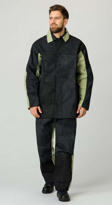 - Куртка: Центральная потайная застёжка на пуговицы обеспечивает надежную защиту от внешних факторов. Полочки, задняя кокетка и передняя часть рукавов дополнены спилковыми накладками, что увеличивает прочность. Вентилируемые отверстия под рукавами и на спинке способствуют комфортному микроклимату, а брезентовая основа под спилковыми накладками гарантирует долговечность.