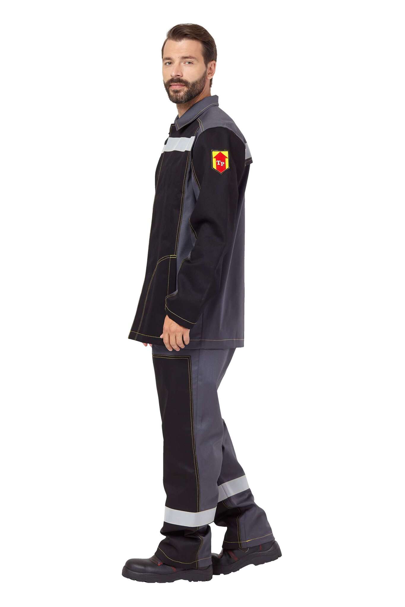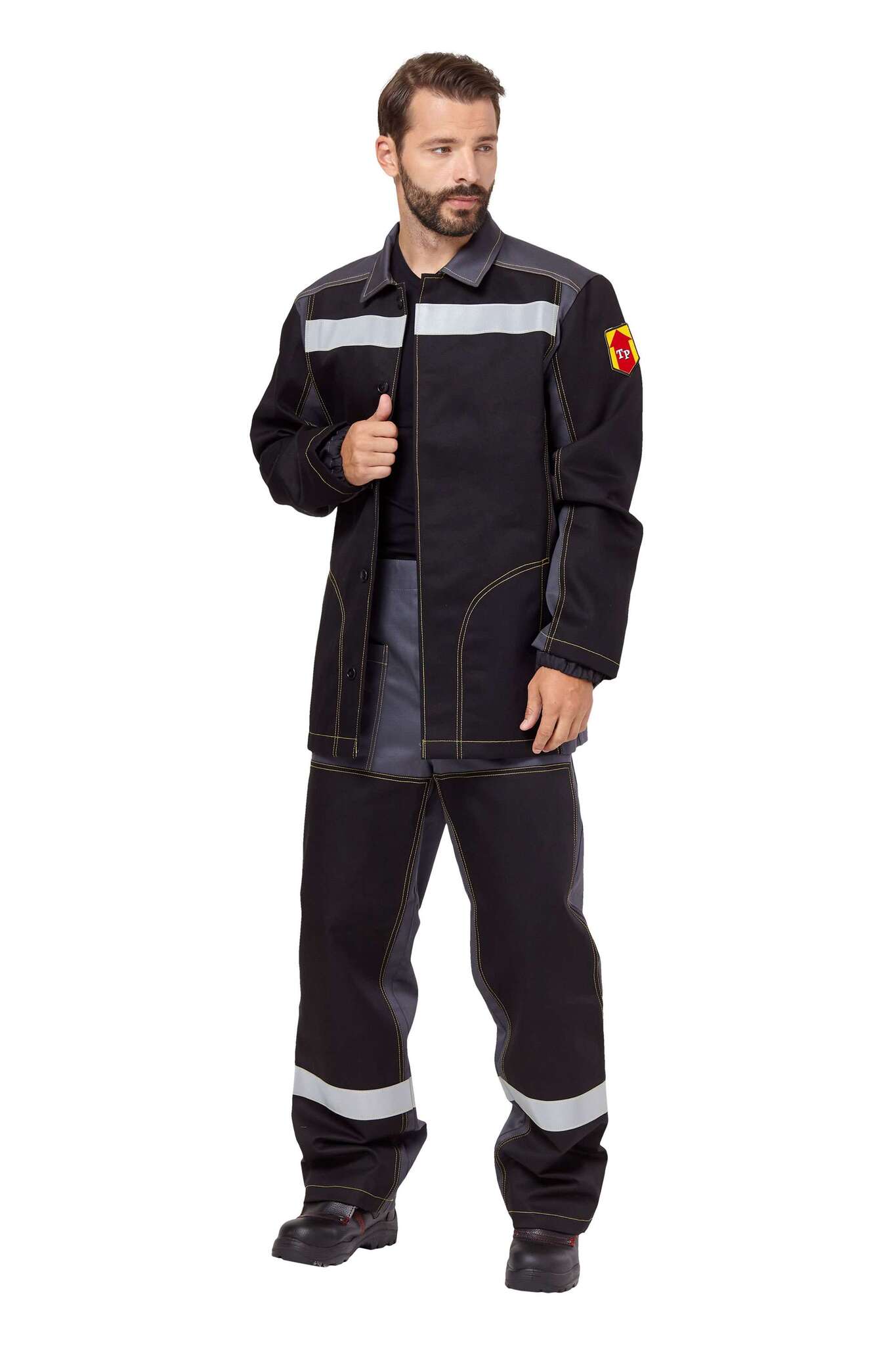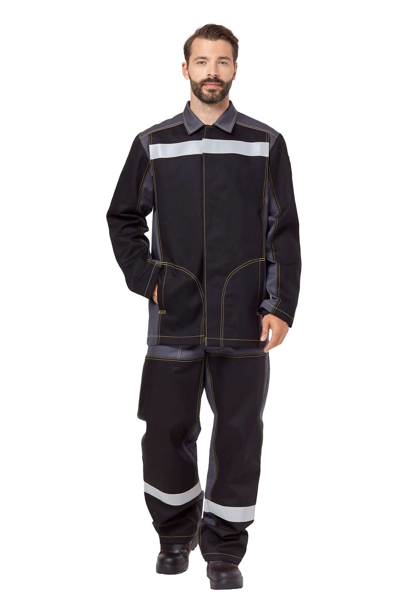 - Элементы защиты: огнестойкие светоотражающие полосы шириной 50 мм, усилительные накладки на куртке и брюках.