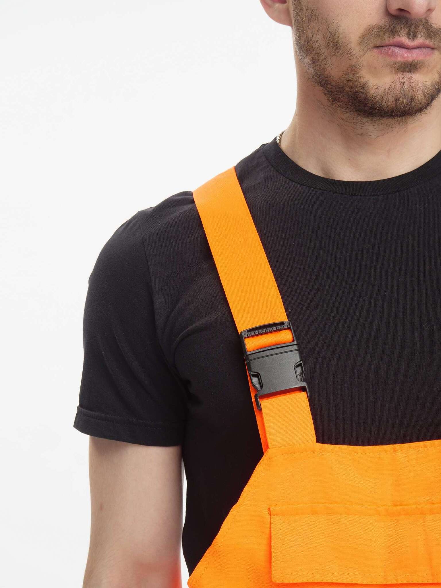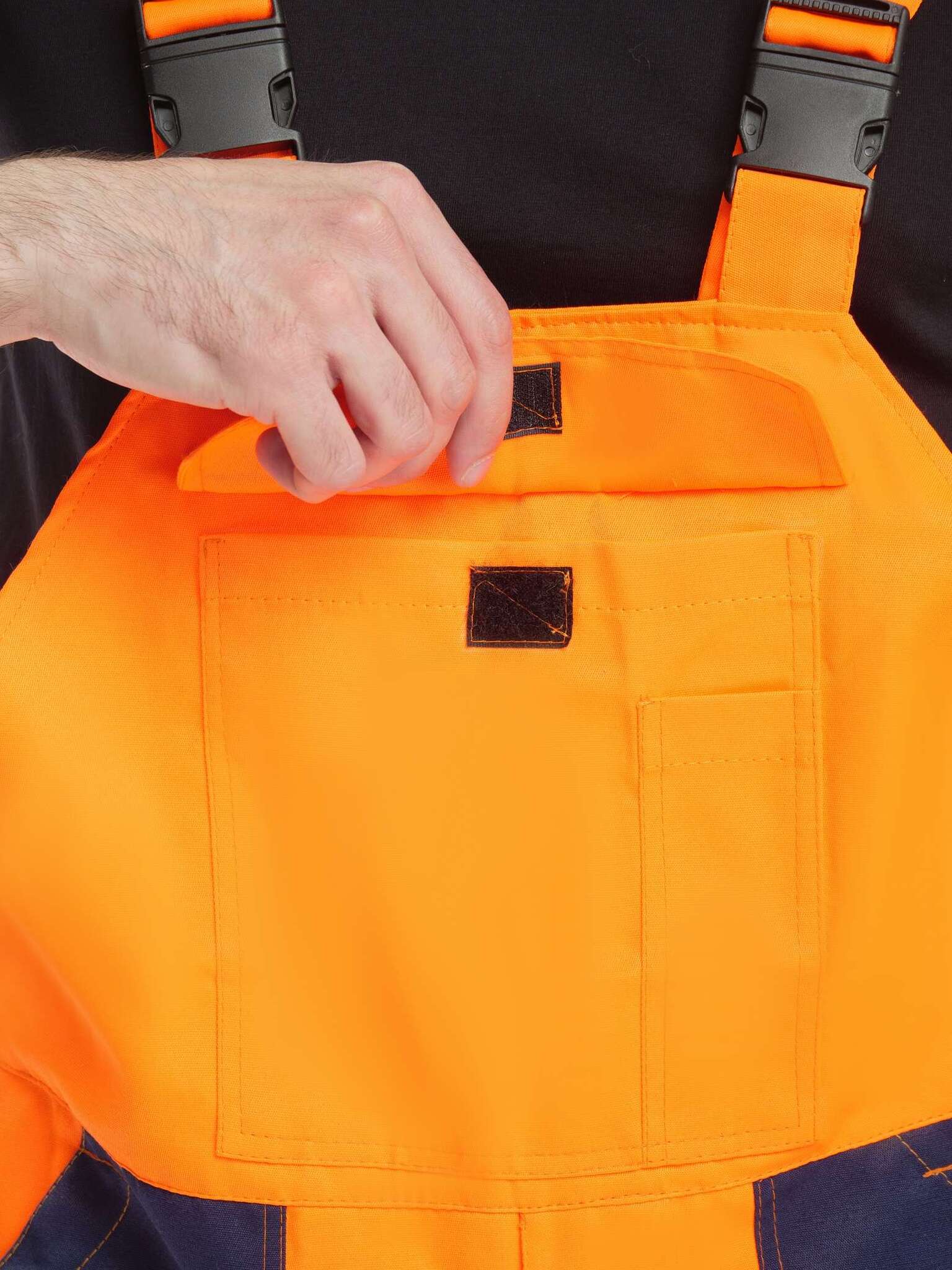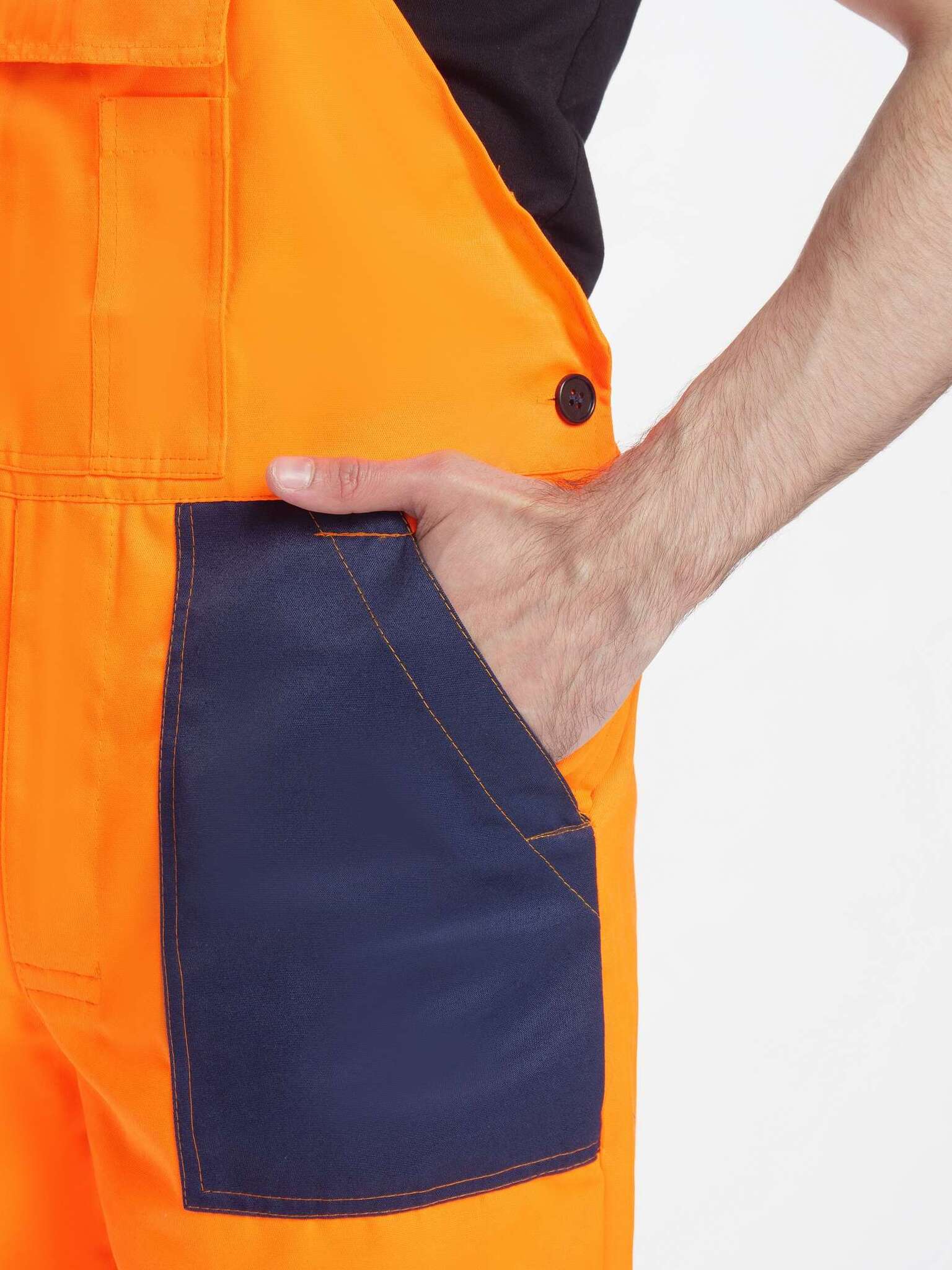 - Полукомбинезон: с притачной спинкой, наколенники и накладные карманы, боковая застежка на пуговицы и гульфик на молнии.