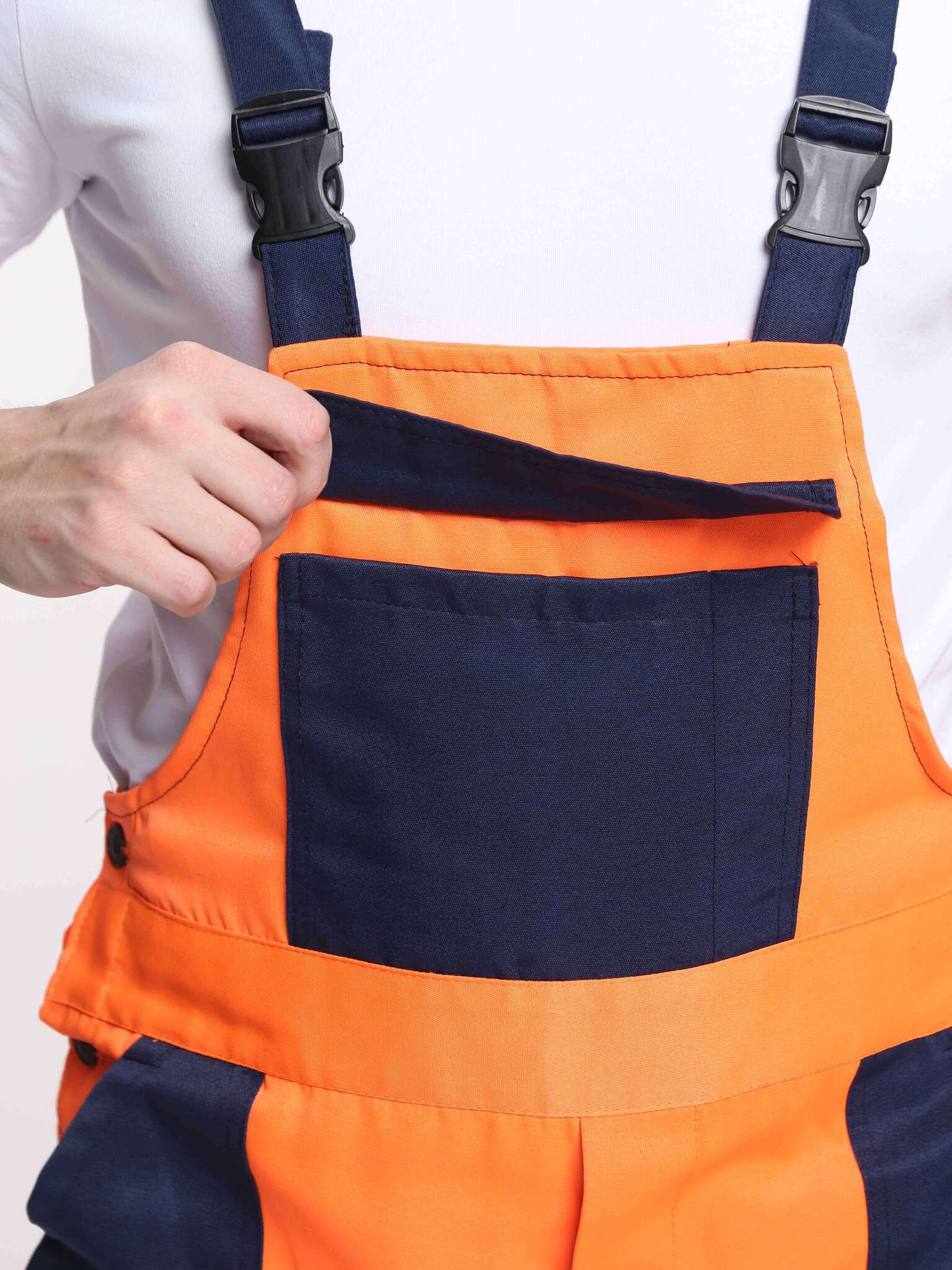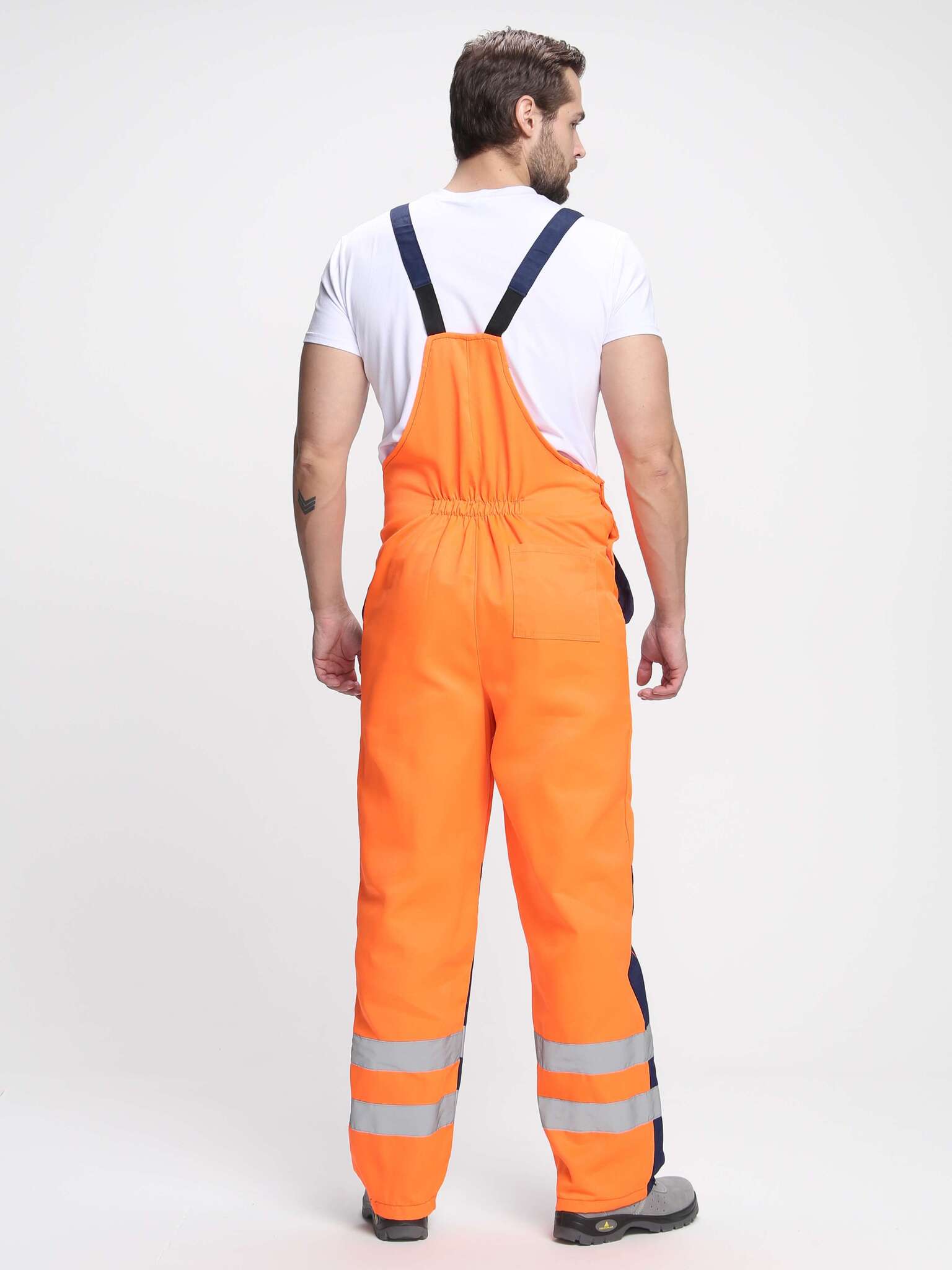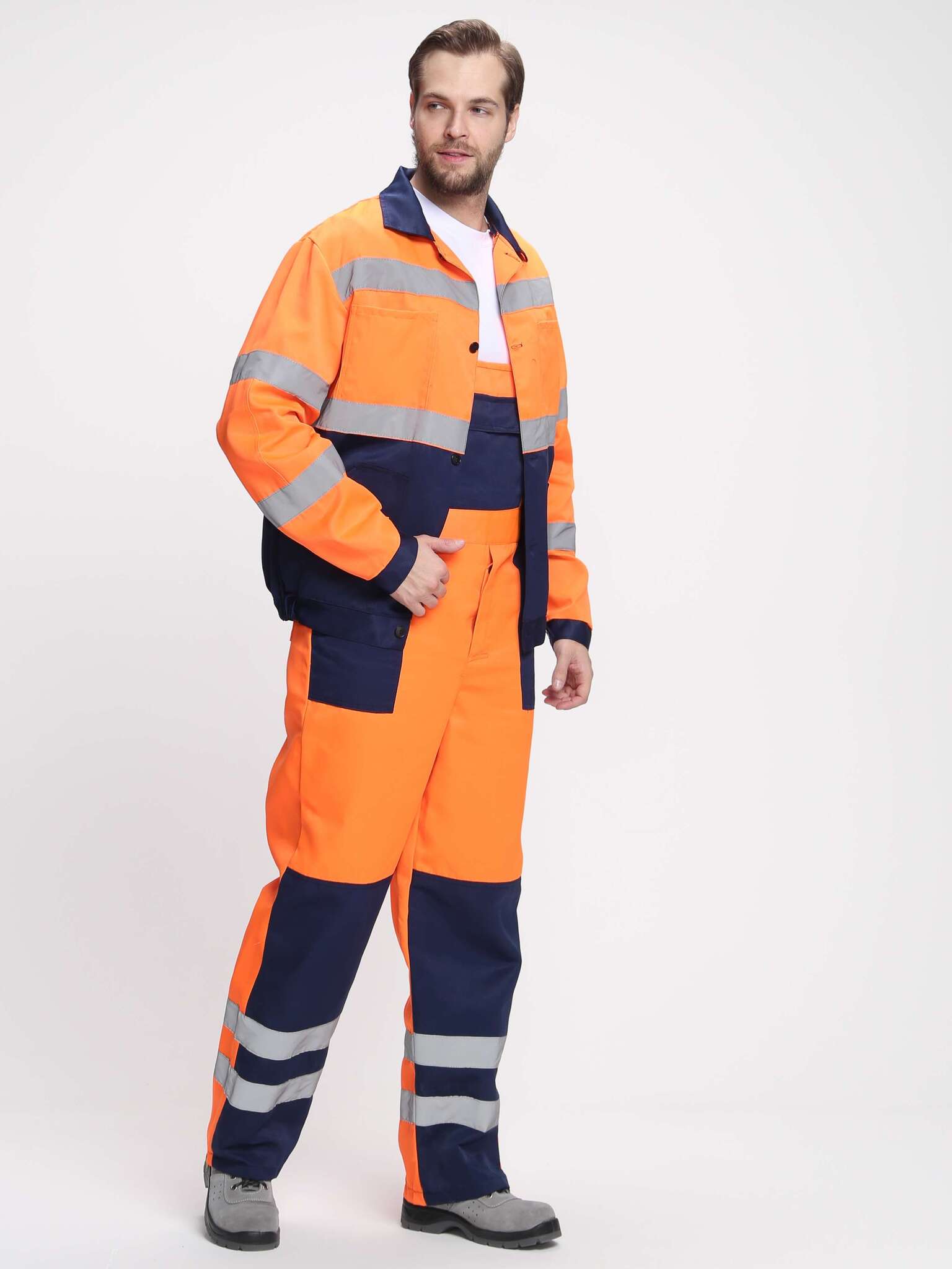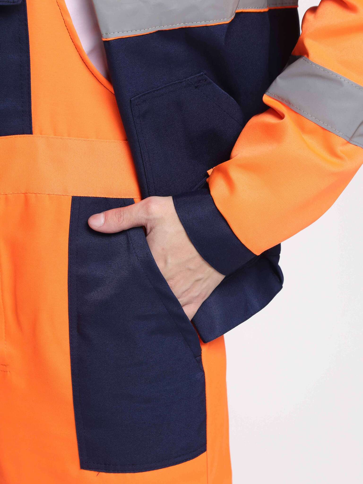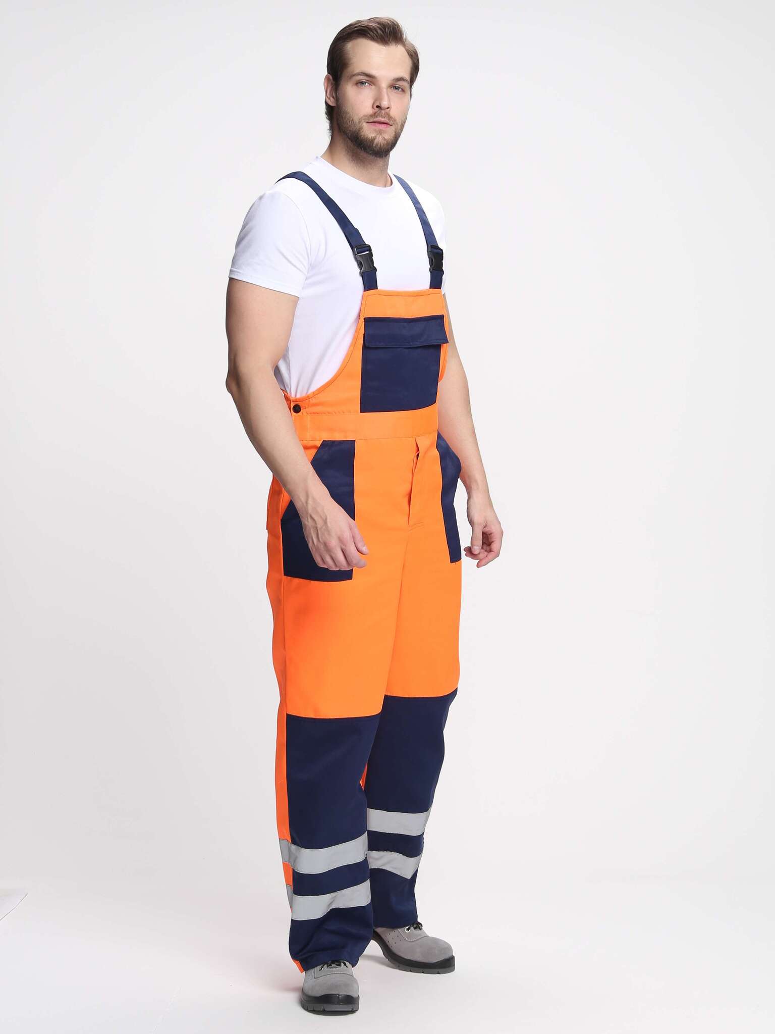 - Светоотражающие элементы: Полосы шириной 50 мм по кокеткам, рукавам и низу полукомбинезона.