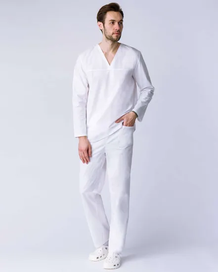 - Блуза: удлиненная прямого силуэта с втачным длинным рукавом и V-образным вырезом горловины. Отсутствие карманов обеспечивает дополнительную безопасность на рабочем месте.