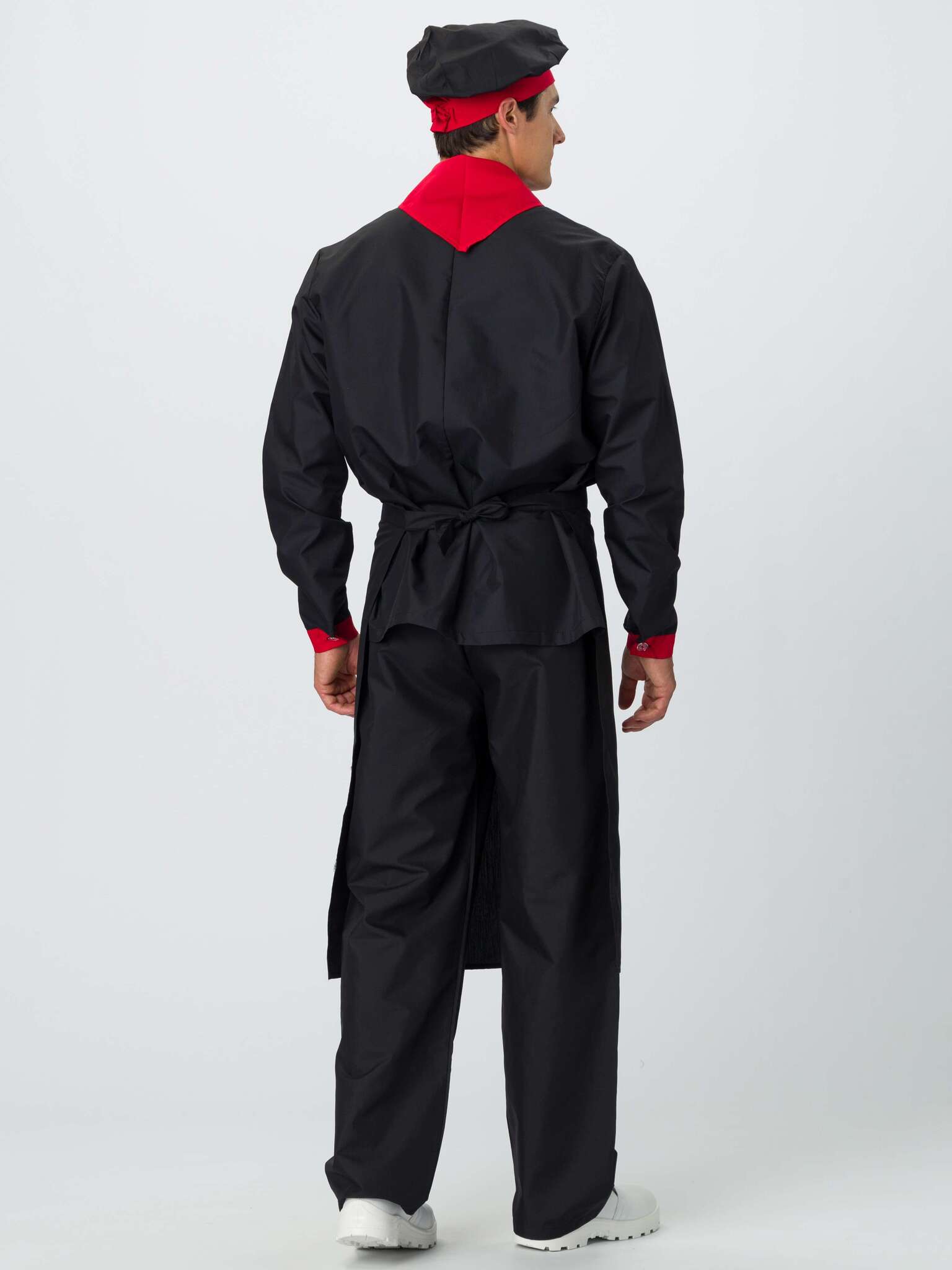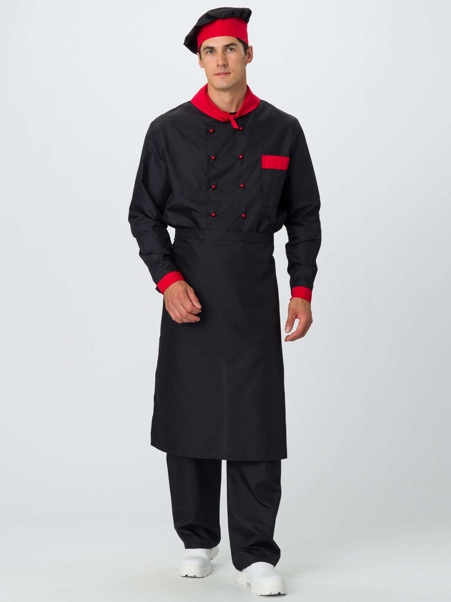 - Комплектация: Костюм состоит из 5 предметов: китель, брюки, поварской колпак, фартук и платок.