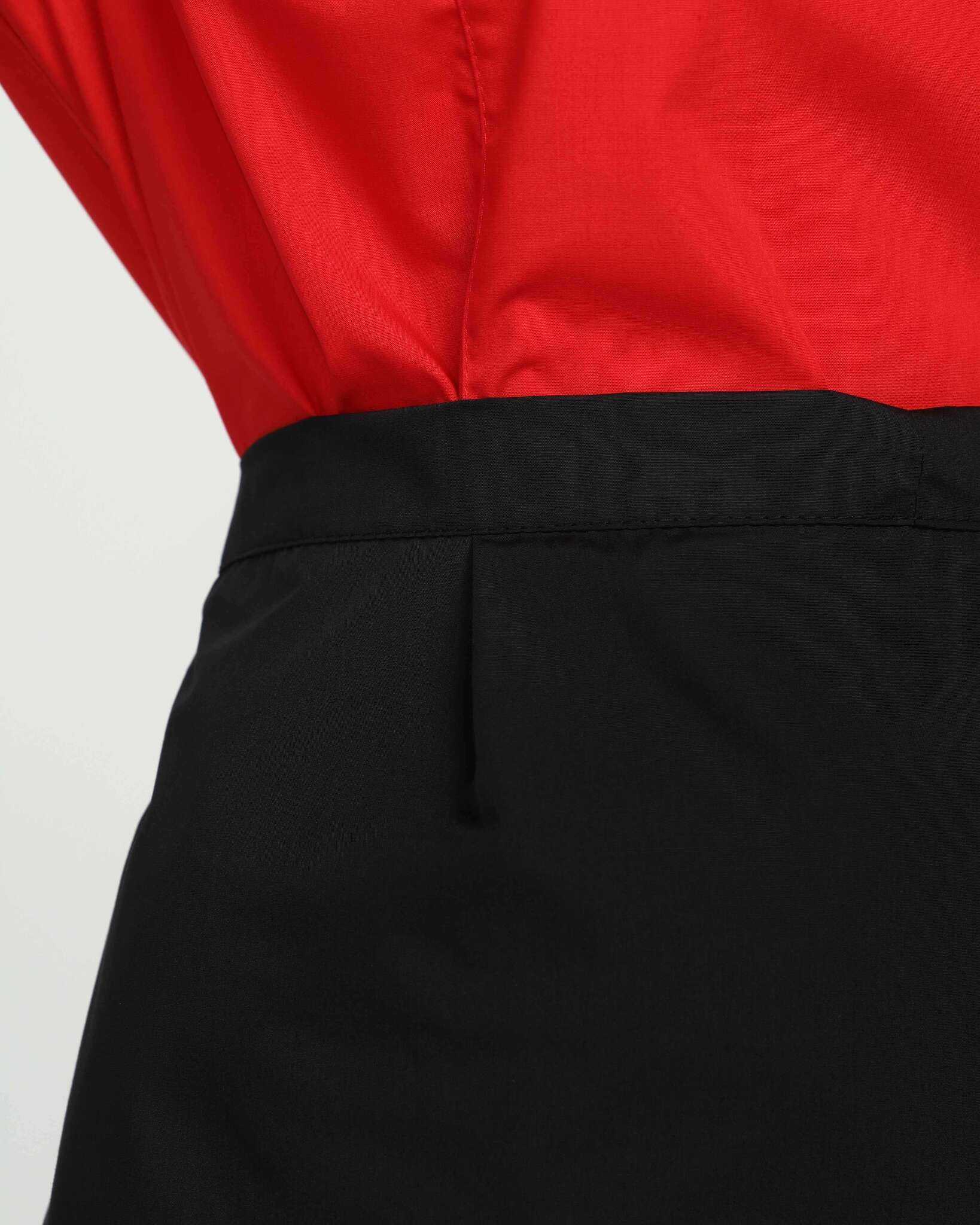 - Фартук: без грудки с завязками для регулировки объема по талии, длиной выше колена и контрастного цвета.