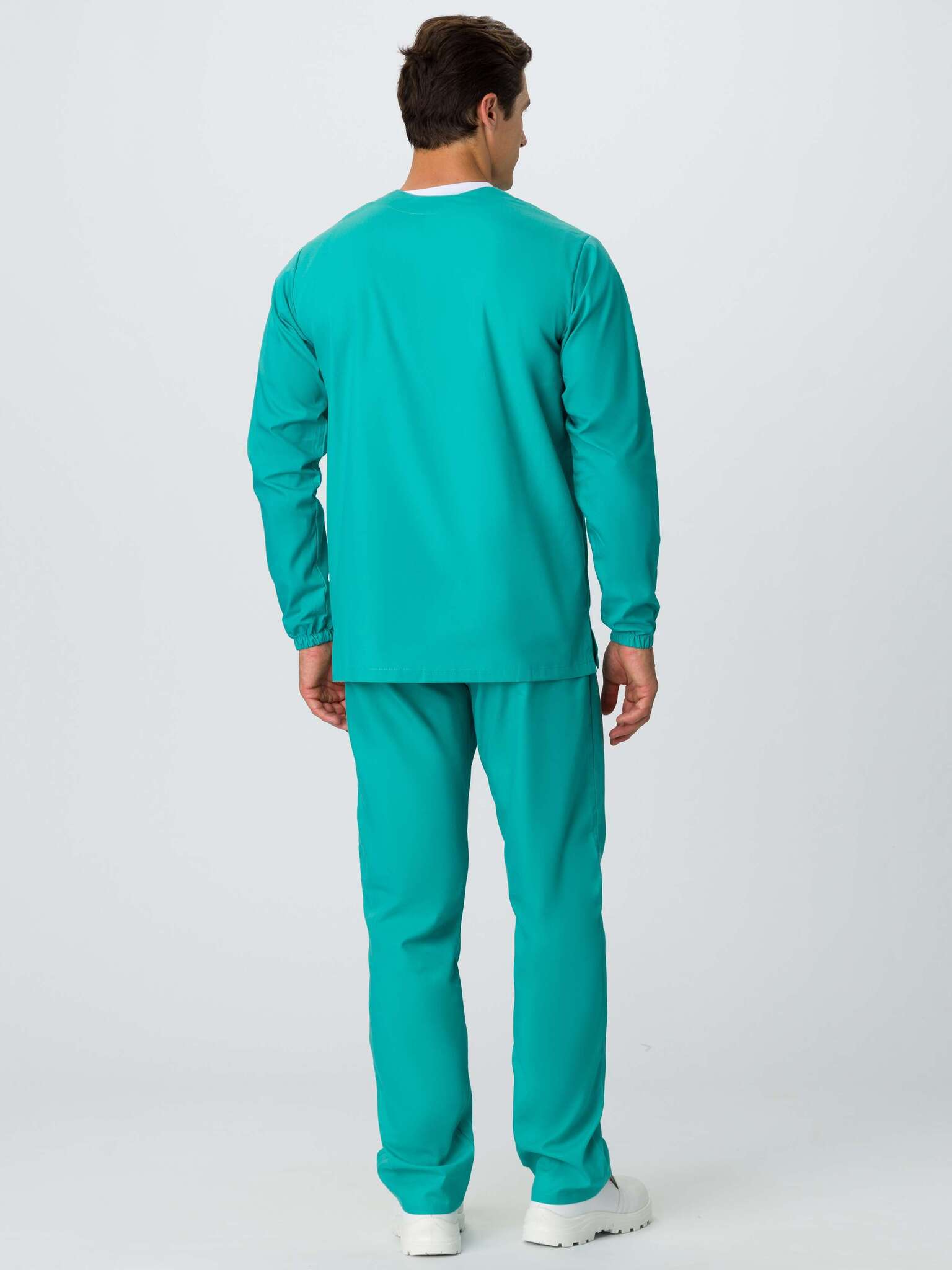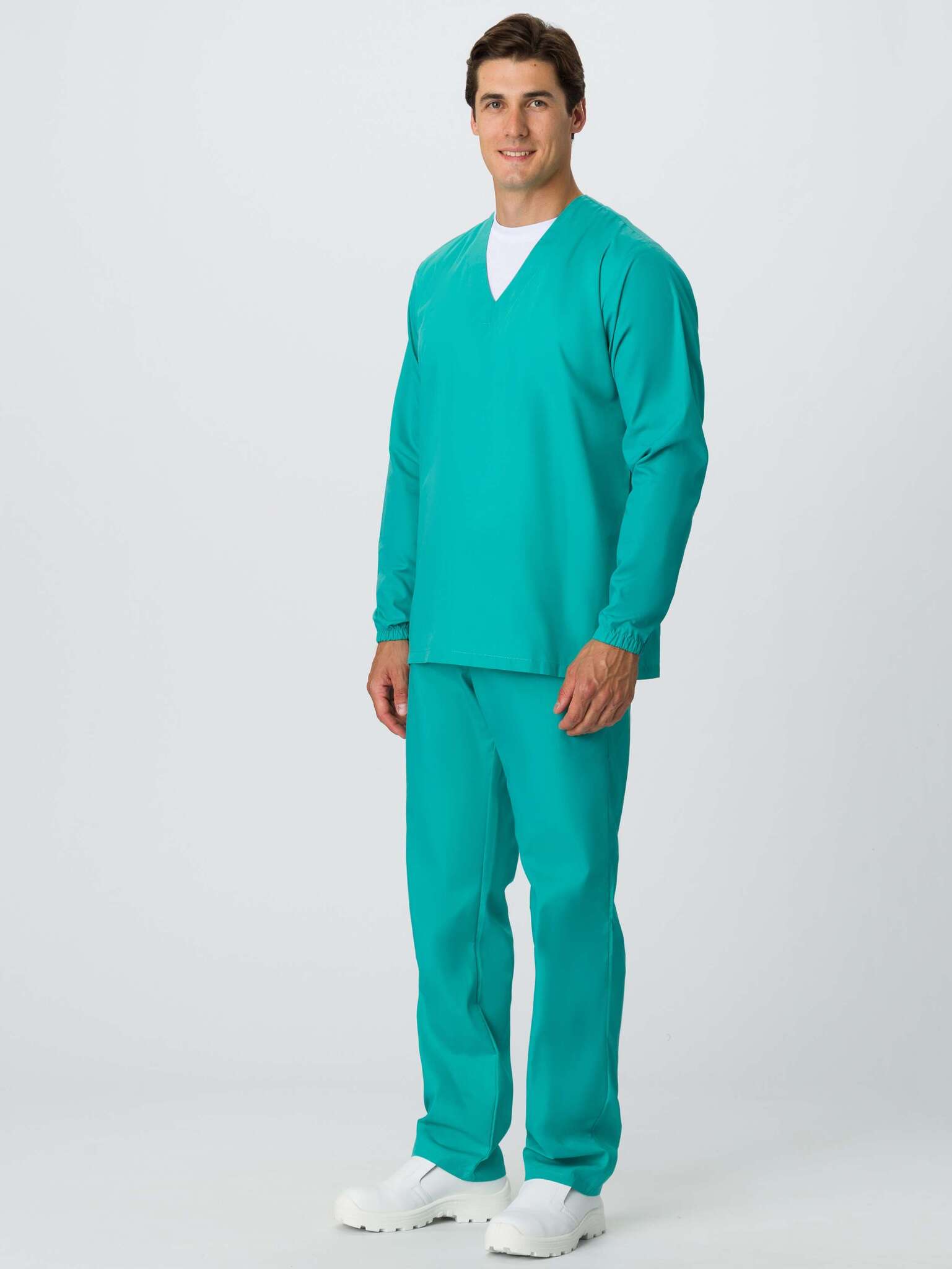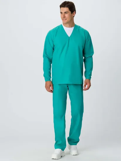 - Блуза: V-образный вырез горловины, низ рукава с эластичной лентой, отсутствие карманов для минимизации риска загрязнения.