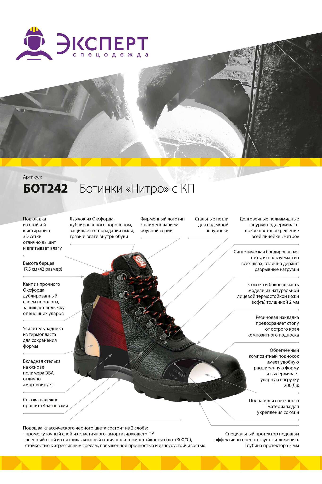 Выбирая ботинки 'Нитро', вы обеспечиваете своим сотрудникам не только защиту, но и комфорт на протяжении всего рабочего дня. Не упустите возможность улучшить условия труда на вашем предприятии!