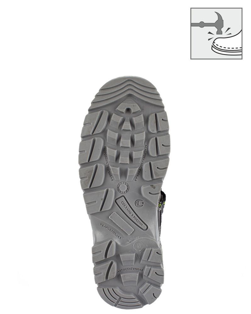 - Подошва: двухслойная (ПУ/ТПУ), маслобензостойкая, с амортизирующими свойствами, сохраняющая свои качества в диапазоне температур от -30°С до +120°С.