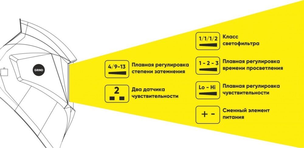 - Регулировка затемнения: Плавная настройка от 9 до 13 DIN позволяет адаптировать маску под конкретные условия работы.