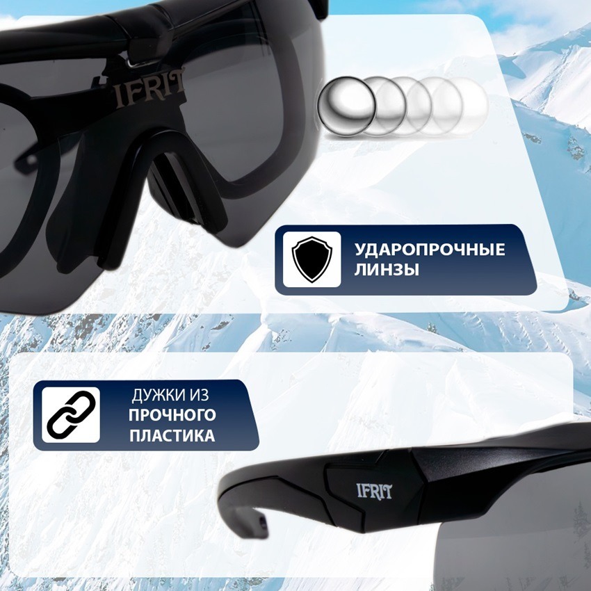 - Материал линз: поликарбонат, обеспечивающий ударопрочность и защиту от осколков.