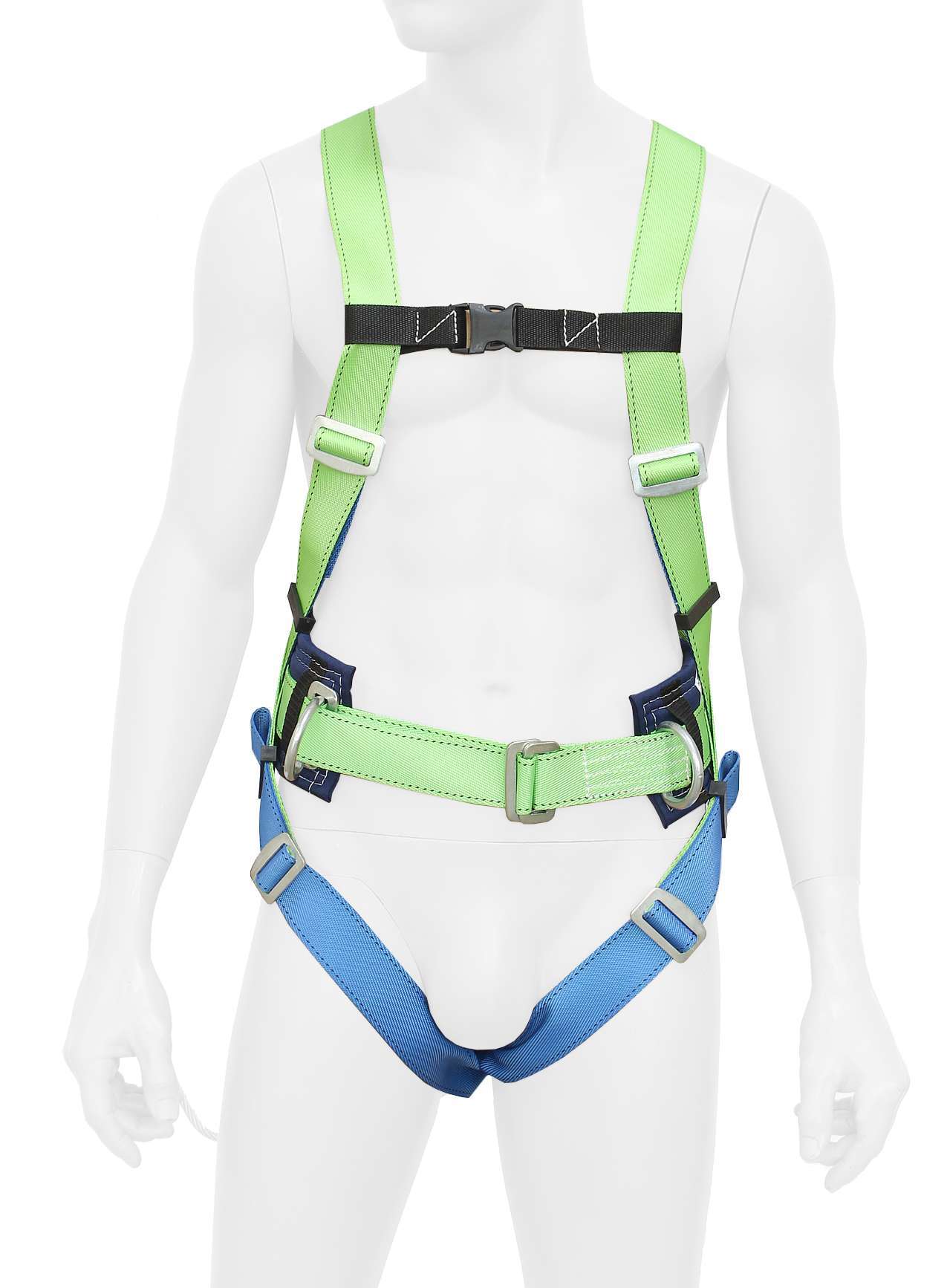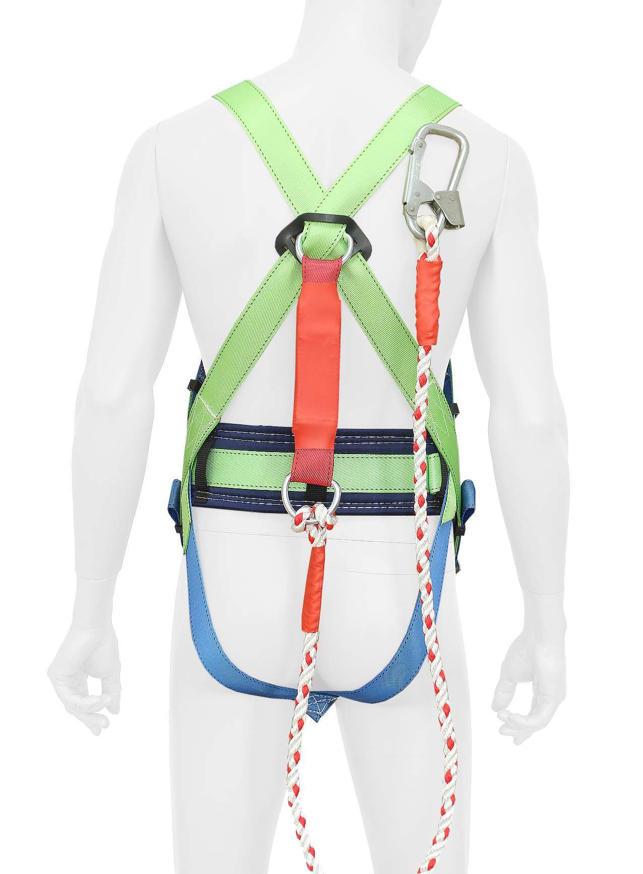 - Структура: Привязь состоит из ремня с пряжкой, наплечных и набедренных лямок, кушака и двух D-колец на поясе для удержания и позиционирования.
