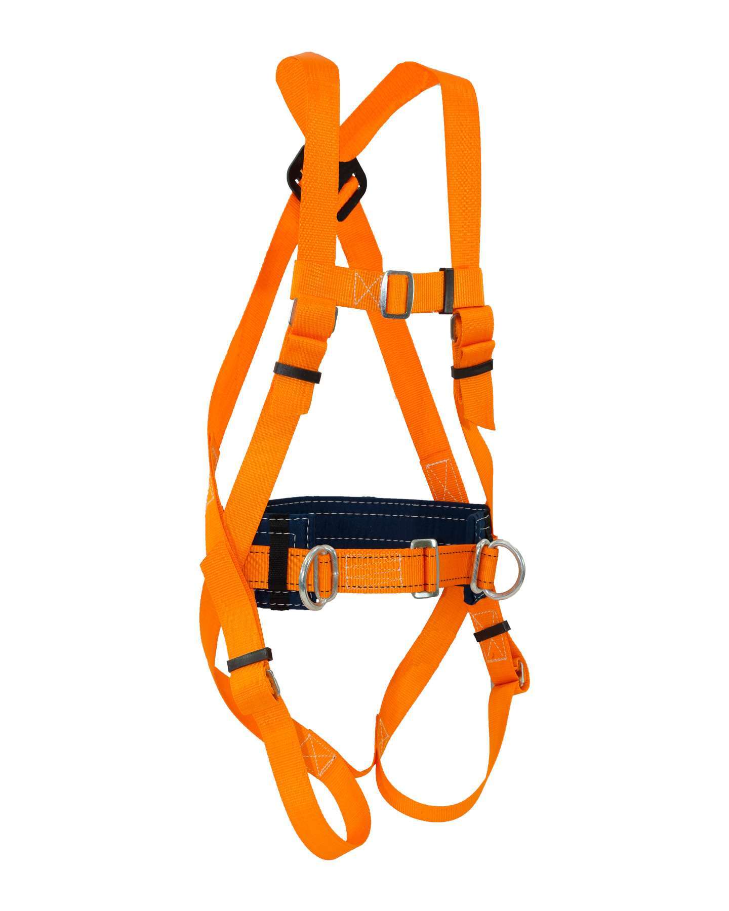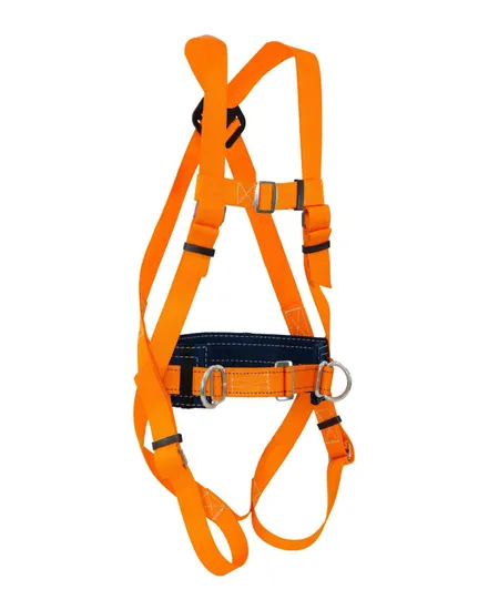 - Конструкция: Привязь состоит из ремня с пряжкой, наплечных и набедренных лямок, кушака, а также двух D-колец на поясе и одного на спине.