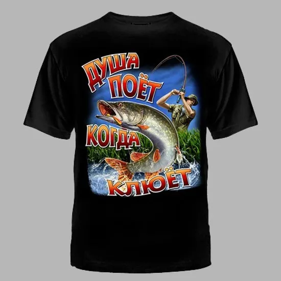 Выберите футболку "Душа поет, когда клюет" и подчеркните свою приверженность к рыбалке с комфортом и стилем!