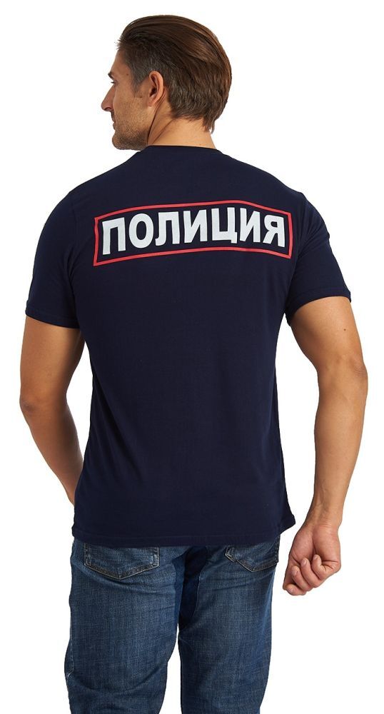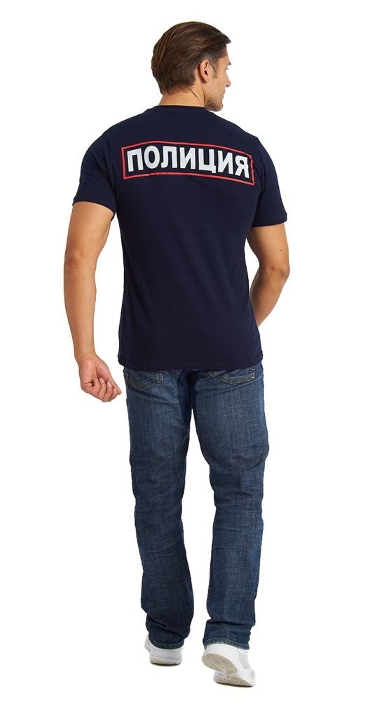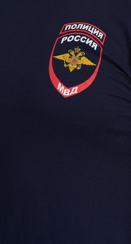 - Дизайн: строгая черная уставная футболка с небольшим логотипом Российской полиции и белой надписью "Полиция" в красной рамке на спине.