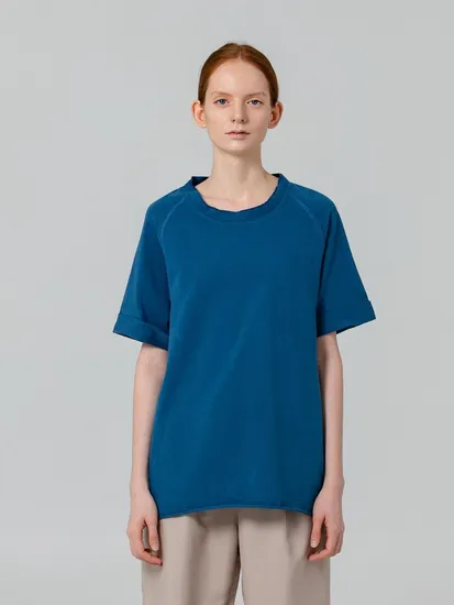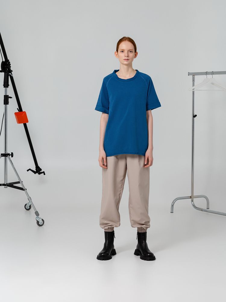 - Детали: воротник рибана тон в тон, открытые края по горловине, рукавам и низу, спинка с декоративными отстрочками, контрастная лента укрепления горловины.