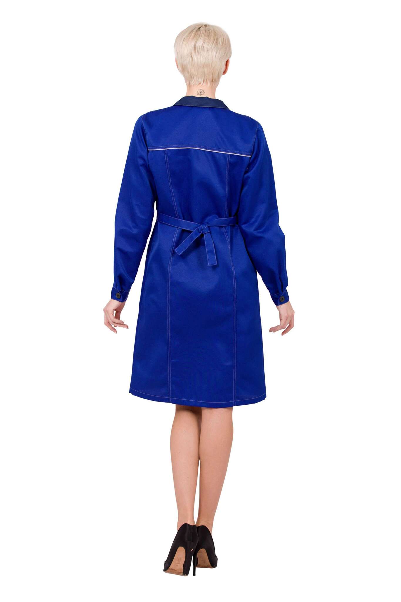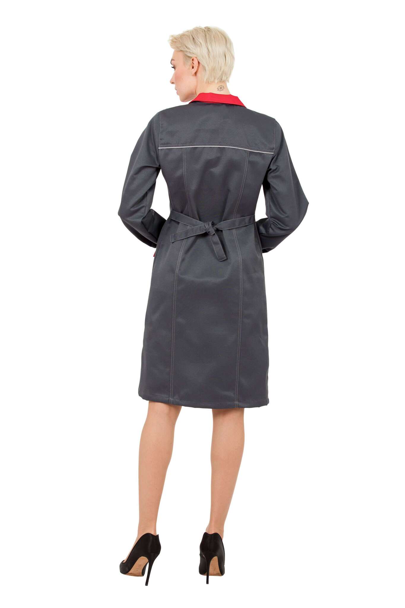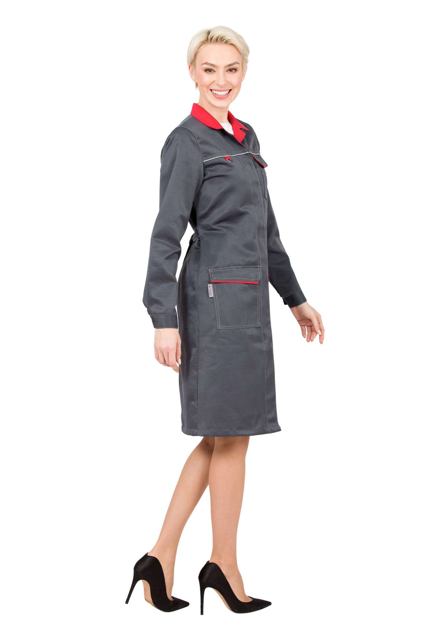 - Элементы комфорта: завязывающийся пояс, полукольцо для бейджа и регулировка ширины манжет рукавов.