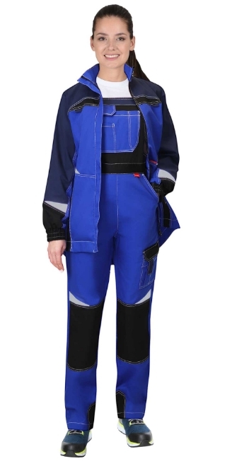 - Полукомбинезон: застежка на 3 пуговицы, внутренние и накладные карманы, регулируемые бретели и усилительные накладки на коленях.