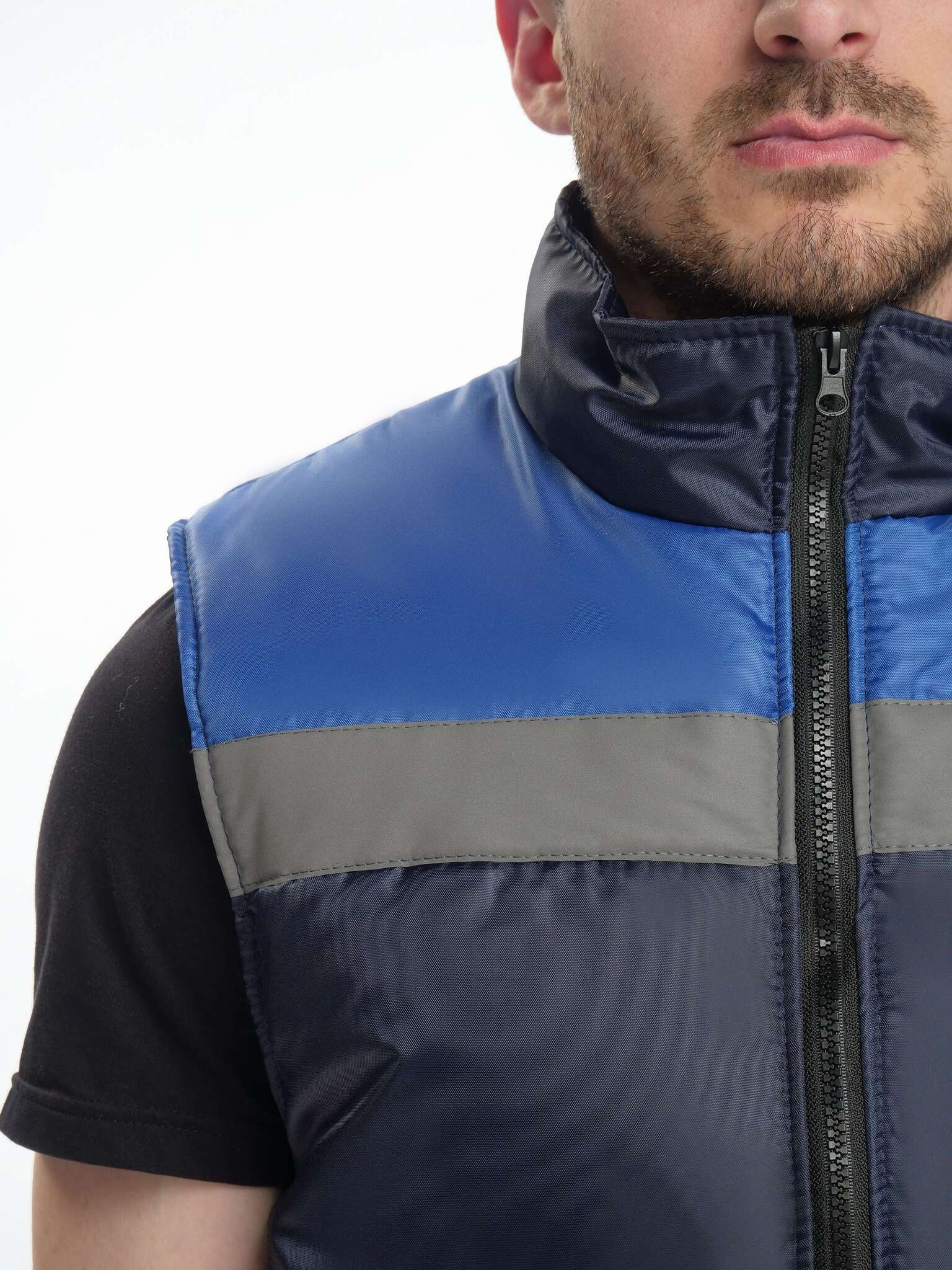 - Светоотражающая полоса: На кокетках жилета настрочена светоотражающая полоса шириной 50 мм для повышения видимости в условиях низкой освещенности.