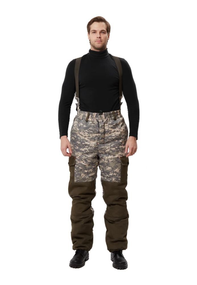 - Брюки: свободный покрой, гульфик с застежкой на пуговицу, два боковых накладных кармана и усиленные накладки в области коленей.