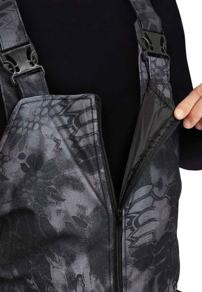 - Полукомбинезон: Высокая грудка и спинка, центральная застежка на двухзамковую молнию, два боковых кармана, регулируемые бретели.